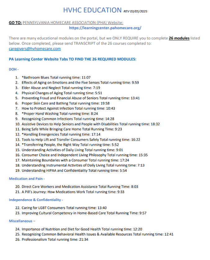 Please Log-In to portal using your own information. Remember to send completion certificates for each module to caregivers@hvhomecare.com